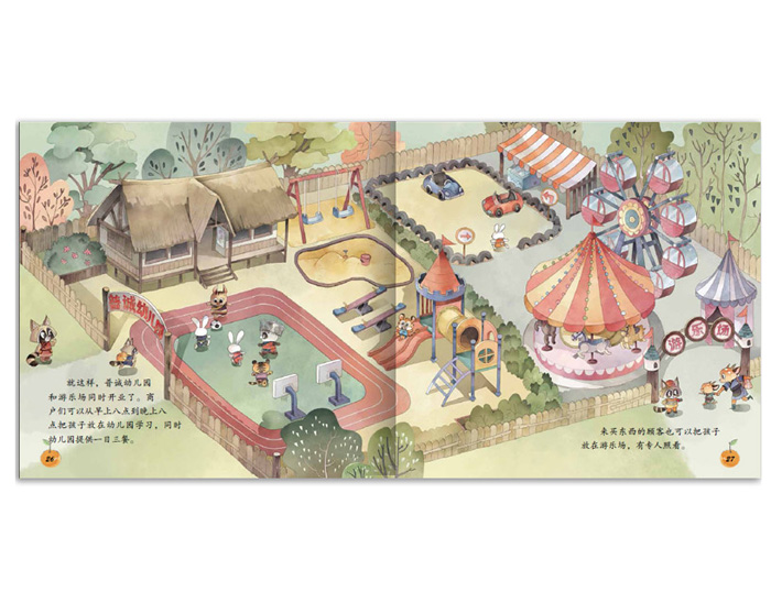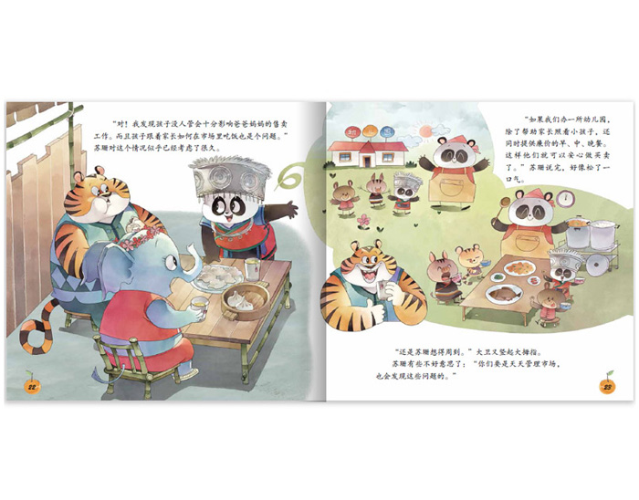在美丽的云南西双版纳有两个隔河相望的村庄:普洱村和柑橘村。普诚市场在大家的帮助下开张了,而且参与的村民众多,生意十分红火。一天,野猪妈妈的孩子在市场内的突然走失了,引起了大家的焦虑并展开寻找。虽然野猪宝宝找到了,但是孩子在市场内的安全问题,引发了熊猫苏珊的思考。经过大家集思广益,苏珊找到了解决办法——在市场内开办普诚幼儿园和游乐场,方便集中照顾孩子。普诚幼儿园解决了商户和顾客带孩子的后顾之忧,市场的生意更加兴旺了。