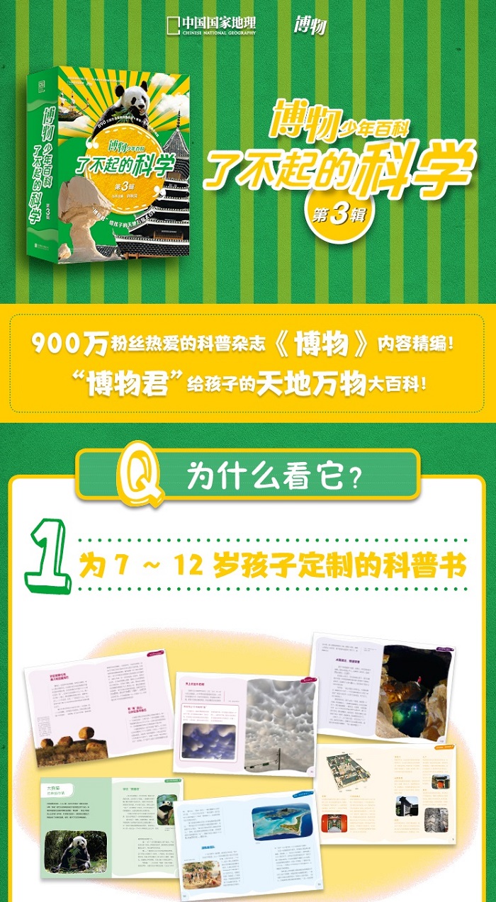 第3辑6本主题分别为:地理奇观、中国珍稀动物、荒野探险、气象、探险&战役&迁徙、中华民居,分别由地理学家、动物学家、探险家、气象学家、历史学家、建筑学家和科普达人改编推荐,以独特的视角,用精美的图片、轻松严谨的文字,成体系的科学知识,为孩子带来一次全新的科学之旅。