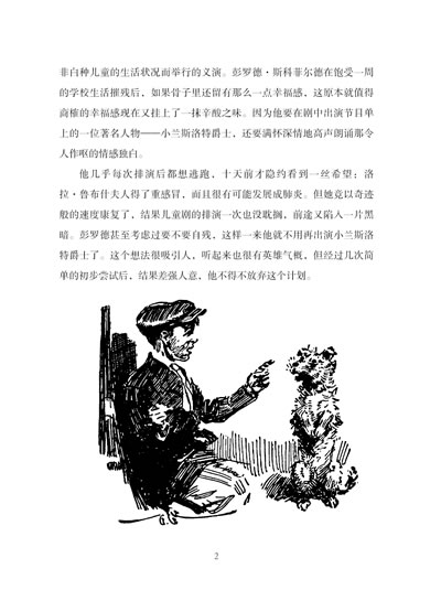 “公爵”这个名字和这只狗其实一点都不配,这狗一看就知道是一系列门不当户不对的“婚姻”的产物。它留着灰白的胡子和不太明显的腮须,身材矮小,样子寒酸,活脱脱就像个老邮差。彭罗德之所以羡慕公爵,是因为他知道公爵永远也不用被逼着去演小兰斯洛特爵士。在他看来,一只狗的生活是自由自在的,像风一样来去自由、无拘无束。但他其实忘了,公爵的生活也得由他来安排。