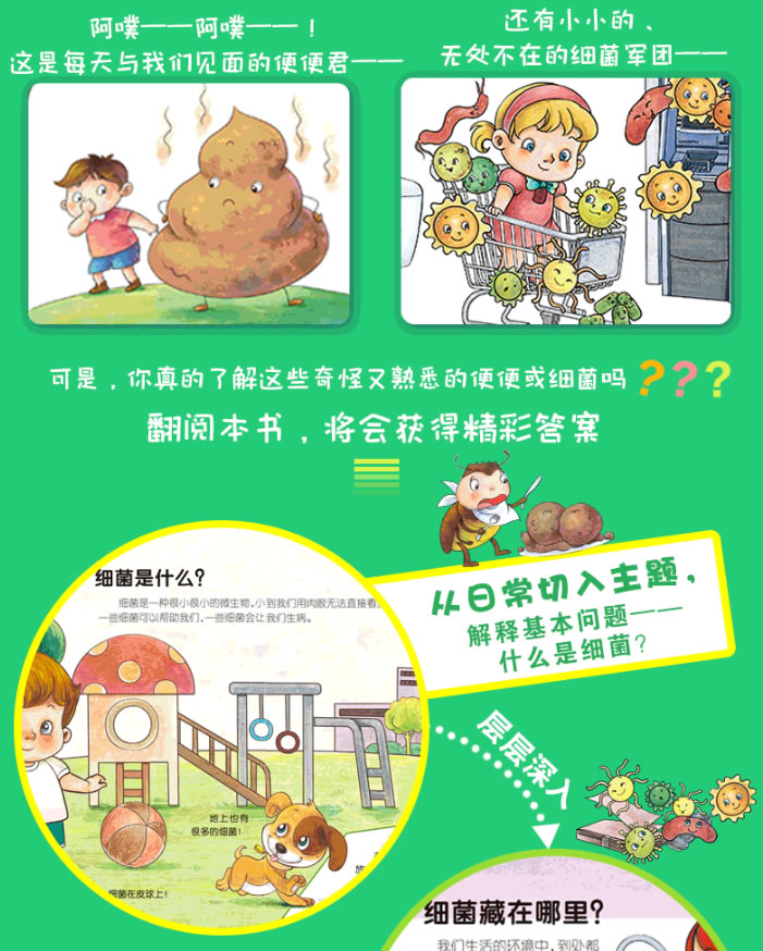 4.内容深入浅出,并注重知识的延展性,引起孩子的阅读兴趣与探求欲望。从基本概念引入,科学简明讲述便便、细菌是什么,进而引导孩子深入了解它们许多不为人知的秘密;