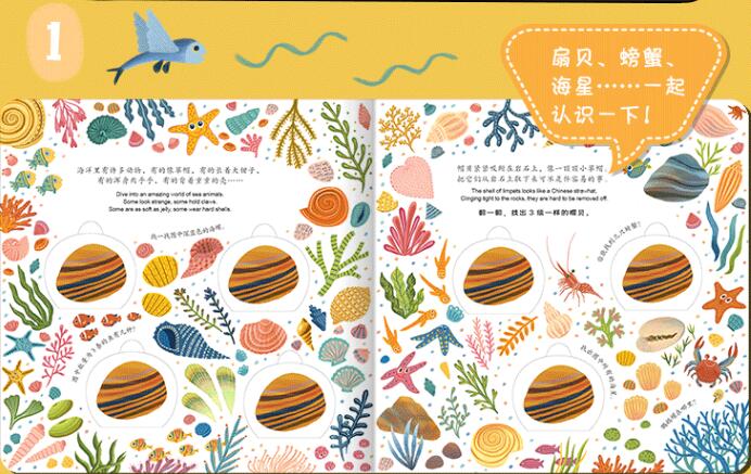 本书以海洋为背景,用拟人化的方式给孩子介绍了海洋中生活的一些生物,螃蟹、海星、海龟、海马等,孩子能轻轻松松理解这些动物的主要特点。全书绘画风格独特,采用零碎的动植物、事物展现了每页中的“主角”主要活动的环境,画风清新、色彩亮丽;另外,翻翻以及视觉记忆游戏的巧妙结合,有趣的找寻游戏,更是对孩子眼力的大考验,能锻炼孩子的记忆力,培养专注力、观察力;巧妙加入的数量变化还能对孩子进行数学启蒙。