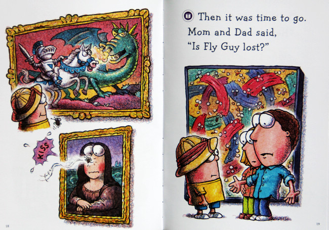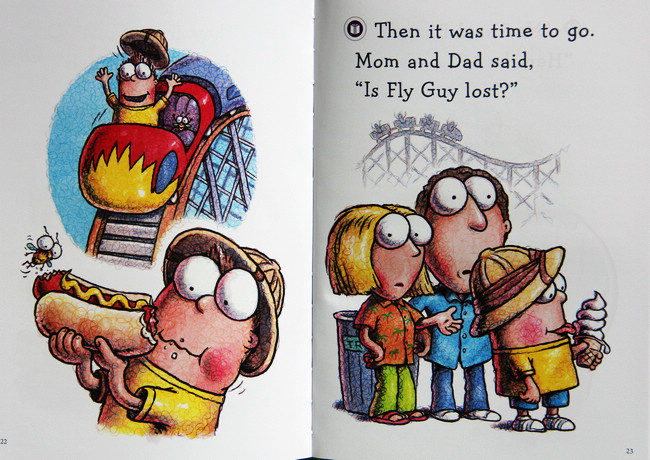 First, Fly Guy gets lost at the picnic site--but he shows up in the garbage can. Then he gets lost at the art museum, but he shows up as part of a modern painting. At the beach, he turns up in a shell, and at he amusement park, on Buzz's hot dog (yuck!).