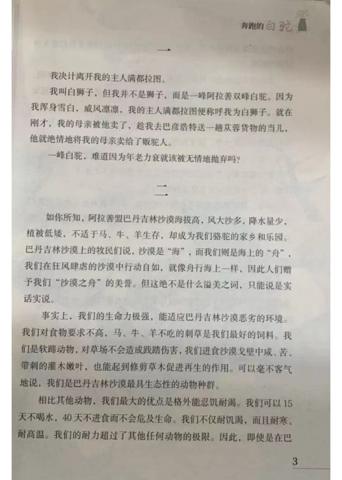 我叫白狮子,但我并不是狮子,而是一峰阿拉善双峰白驼。因为我浑身雪白,威风凛凛,我的主人满都拉图便称呼我为白狮子。就在刚才,我的母亲被他卖了,趁我去巴彦浩特送一趟从蓉货物的当儿,他就绝情地将我的母亲卖给了贩驼人。 峰白驼,难道因为年老力衰就该被无情地抛弃吗?