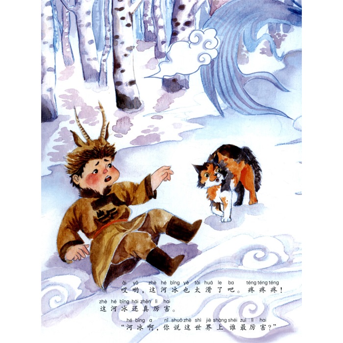 《谁最厉害?》是连环套式童话。冬天,一个小男孩在冰上玩儿,忽然仰面朝天滑到了,爬起来问冰:冰啊冰,谁有本事?冰答道:我啊,不然能滑到你。男孩又问:你有本事的话,那你为什么被太阳融化了呢?冰答道:唉,那就太阳有本事吧。小男孩又问太阳:太阳啊太阳,谁有本事?太阳答:我啊,不然能融化冰。小男孩又问:你有本事的话,那你为什么让云遮住了呢?太阳答:唉,那就云有本事呗……如此连环,云遮住了太阳,风吹散了云,大树挡住了风,小猫爬上了树……谁最有本事呢?这个童话故事内容环环相扣,因果相联,语言句句相接、上下相关,流畅自然又幽默有趣,还具有知识性和哲理性。