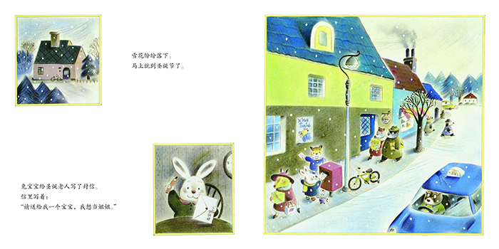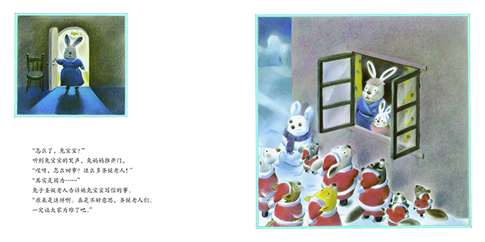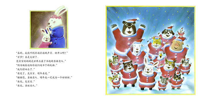 圣诞节要到了。小兔子给圣诞老人写了封信:“请送给我一个宝宝,我想当姐姐。”这可让兔子圣诞老人犯了难,什么礼物都可以送,就是无法送宝宝啊。于是,兔子圣诞老人去向狐狸圣诞老人、老鼠圣诞老人、山羊圣诞老人商量,大家都没有好办法。圣诞节这天,所有圣诞老人都来到了小兔子家,得知情况的小兔子很失望。这时,兔妈妈走了出来……
