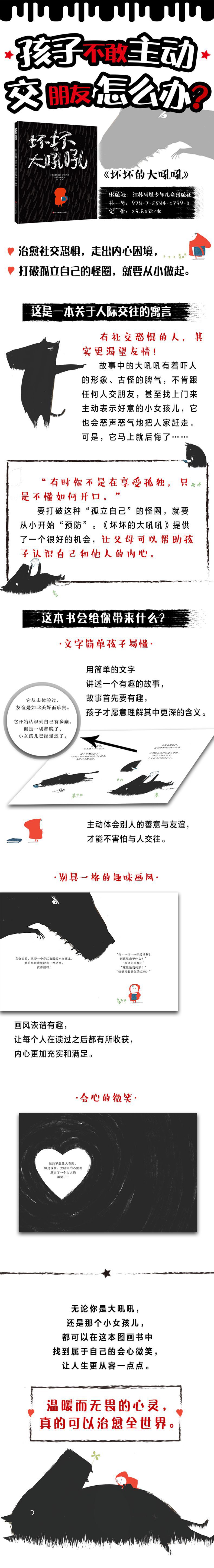 这是一本关于人际交往的寓言。有社交恐惧的人,其实 渴望友情! 故事中的大吼吼有着吓人的形象、古怪的脾气,不肯跟任何人交朋友,甚至找上门来主动表示好意的小女孩儿,它也会恶声恶气地把人家赶走。可是,它马上就后悔了…… 大吼吼并不是现实中存在的某种动物,也许可以说,它象征着人们心中的阴影。有的人就是这样,明明渴望友情,却不知道怎么和别人打交道。他越是恐惧社交,态度越是不好,别人越是不敢理他——这岂不是一个怪圈? “有时你不是在享受孤独,只是不懂如何开口。” 要打破这种“孤立自己”的怪圈,就要从小开始“预防”。《坏坏的大吼吼》提供了一个很好的机会,让父母可以帮助孩子认识自己和他人的内心。 有的孩子是大吼吼,那么,他会从这个故事中学会正视自己,接纳自己,与别人正常而愉快地交往;有的孩子 像那个小女孩儿,那么,故事会告诉他,不要害怕别人一时的冷漠和拒 ,温暖的真心终将融化冰雪。 再往深处想,也许大吼吼曾经也是那样一个活泼可爱的小女孩儿呢。就是因为遭到同样的简单粗暴的对待,它才伤了心,变成现在的样子……所以,认识自己、理解他人,又是多么重要啊! ※阅读小提醒※ 《坏坏的大吼吼》有不同的读法,可以只把它当成一个有趣的故事,也可以用心体会其中 深的含义。亲子共读时,父母和孩子各自扮演一个角色,把图画书中的对白大声朗读出来;或者是一起进行“再创作”——在大吼吼遇到小女孩儿之前,或者他们成为好朋友之后,又会发生怎样的故事呢?小女孩儿送给大吼吼的那本书,可以是什么书?说不定,那就是另一个版本的《坏坏的大吼吼》呢!