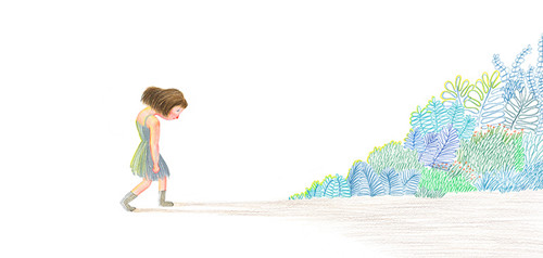 翻开封面,是彩色铅笔线条勾勒的错落草丛,藏青、竹青、铜绿、嫩绿、墨绿、翡翠绿……哇,原来绿和蓝之间,有这么多变化。透亮的蝴蝶页,仿佛有风轻拂、阳光洒落。从张力十足的封面,一下子,转入神秘的疗愈之境。
