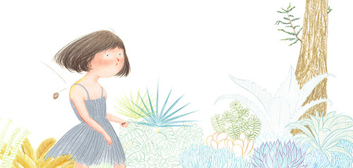 不知道故事一开始女孩到底发生了什么事?但随后她走入了森林。女孩,可以置换成任何一个人。每个失意的人都可以在大自然中得到慰藉,像故事中的女孩一样。但,前提是,我们身边的大自然仍充满活力与健康的循环。故事的结尾很美,具象地展现了善意的生生不息:女孩和松鼠合力种下一颗松球果,松球果发芽长成小树……*后一个跨页,是一大片绿松林。人类从森林得到“礼物”,也要学着与自然共生,反馈自然,回送一份“礼物”……