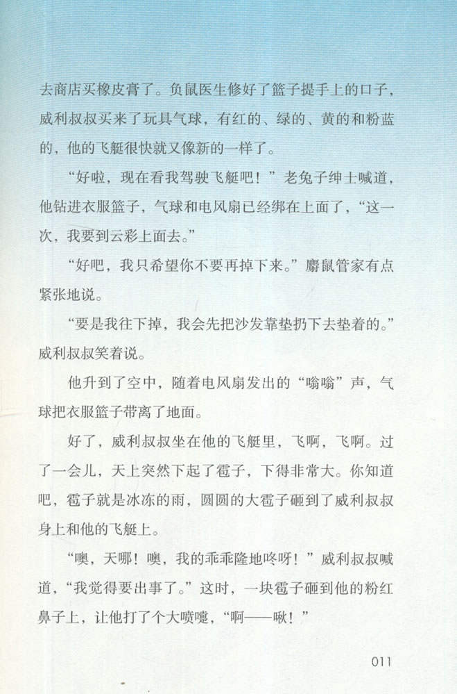 《威利叔叔的飞艇》 长耳朵老兔子绅士有一天突发奇想,自己发明创造了一艘飞艇,这艘飞艇是由衣服篮子、玩具气球、日本雨伞和电风扇做成的。威利叔叔每天开着飞艇出门寻找冒险,当然他也用飞艇帮助了很多朋友。
