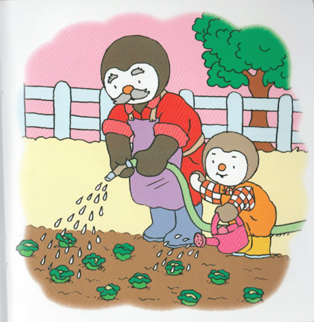 今天,乔比在爷爷奶奶家。他帮爷爷种菜,浇水,除草,采集豆子、水果和玫瑰花。到了屋子里,奶奶来了,可是篮子里的东西都被乔比吃光了!真是个贪吃的小家伙。