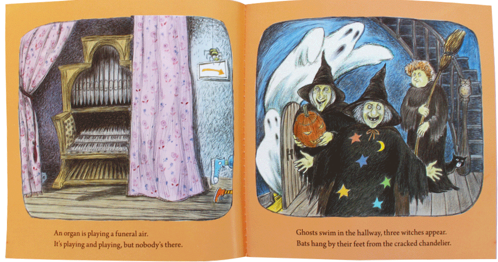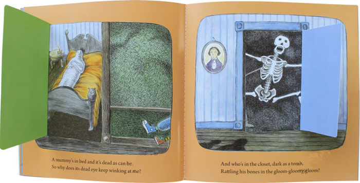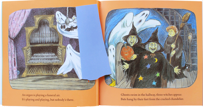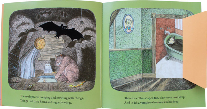 无限乐趣,尽在这本“鬼屋”探险翻翻页!两个主人公巧妙的藏身于书页的一角,顺利的把主角转化成了正在看书的小读者们——勇敢翻开书页的隐藏秘密,真真切切感受到万圣节的“恐怖”有趣!