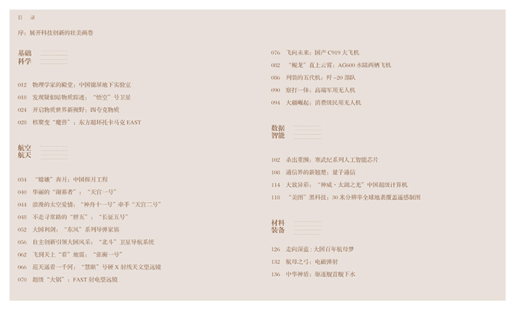 本书收录了党的十八大以来我国科技领域取得的重大科研成果和发明发现,包括天宫、蛟龙、天眼、悟空、墨子、大飞机等重大科技成果,展示十八大以来我国科技事业取得的伟大成就,全景式回顾这些科技成果对经济社会发展的深刻影响,同时向公众特别是青少年系统介绍我国建设创新型国家的战略部署及新成果、新方法、新思维,增强民族自信和文化自信。全书图文并茂,内容通俗易懂。