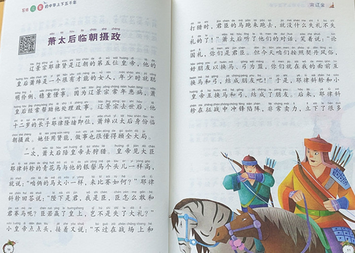 本书是一部完整展示中华民族 上下五千年历史的学生读本。全书共分十册:《 史前至西周》《春秋》《战国》《秦汉》《三国两晋南北朝》《隋唐》《宋辽金》《元》《明》《清》。语言浅显易懂、生动有趣,以时间为主线,以历史人物左右朝政、推动变革、沙场征战 的某些片段为辅线,还广泛涉及文学、艺术、教育等领域,展现了王朝更迭的历史图景,昭示了历史人物的文治武功与功过荣辱。