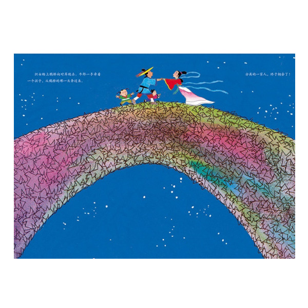 本书由著名儿童读物图书插画家、《东方娃娃》艺术总监、原《儿童故事画报》主编王祖民绘画,以水粉形式绘就,用现当代美学理念来展现中国经典民间故事,色彩明快,充满童趣;知名儿童图画书学者、北京师范大学文学教授陈晖配文。 《牛郎织女》是中国四大民间传说之一。传说古代天帝的孙女织女擅长织布,每天给天空织彩霞。她讨厌这枯燥的生活,就偷偷下到凡间,嫁给善良的凡人牛郎,生下一双儿女,过上男耕女织的生活。此事惹怒了天帝,他把织女捉回天宫,只允许牛郎和织女在每年的农历七月七日相会一次。可银河太宽,他们依然无法相聚,最后无数喜鹊飞来,在天河上架起了一座鹊桥,分离的一家人,终于相会了。
