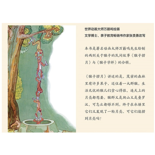 本书是著名动画大师万籁鸣先生绘制的两则关于猴子的民间故事《猴子捞月》与《猴子学样》的合辑。 《猴子捞月》讲述的是,茂密的森林里有许多果子,还住着一大群猴。生活无忧的猴儿们贪心得很,连天上的月亮都想要。猴群又是爬山又是叠罗汉,可怎么都够不到。终于在水塘里它们又发现了一轮月亮,可它们能捞到月亮吗? 《猴子学样》讲述的是,一个老头儿挑着一担草帽上城里去卖。走到半路上,老头儿累了,放下担子,坐在大树底下休息,不知不觉睡着了,等到醒来才发现,草帽被树上的一群猴子拿了去。老头儿很着急,抓耳挠腮地让猴子还草帽,但猴子只是学他的样戏耍他。最后,老头儿抓住猴子这个弱点,取回了草帽。