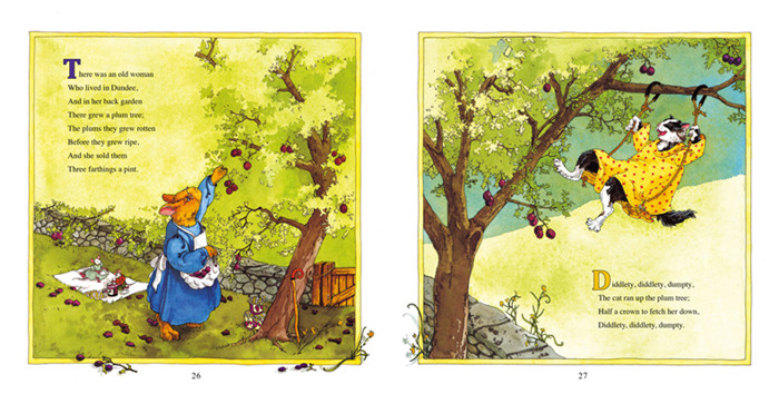 于是,为了让这本《鹅妈妈童谣》拥有独一无二的气质,我下了许多功夫。除了那些家喻户晓的童谣,我在这本书中加入了一些不太为人所知但仍然值得细细品读的童谣。我软化了那些对孩子们来说比较可怕的形象,同时尝试着保留鹅妈妈童谣的经典特质。比如 The Old Woman in the shoe这首童谣,改变任何一个单词我都觉得不合理,但是我会试着配上一张温和的图片。这并不意味着我把童谣中的形象现代化了,而是我尝试着说明押韵可以用不同的方式解读。这本书里,吃南瓜的皮特的妻子舒服地待在南瓜壳里;摇篮里的小宝宝是一只羽翼未丰的小鸟;胖蛋也是一个深受喜爱的角色,虽然他没办法将他的壳再拼凑起来了,但结尾可以带来惊喜:一个破碎的蛋并不总是麻烦,有时候会是一只小鸭子。