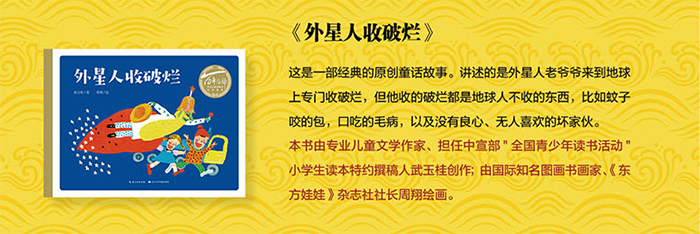 《外星人收破烂》:经典原创童话故事。讲述的是外星人老爷爷来到地球上专门收破烂,但他收的破烂都是地球人不收的东西,比如蚊子咬的包,口吃的毛病,以及没有良心、无人喜欢的坏家伙。由专业儿童文学作家、担任中宣部"全国青少年读书活动"小学生读本特约撰稿人武玉桂创作;由国际知名图画书画家、《东方娃娃》杂志社社长周翔绘画。