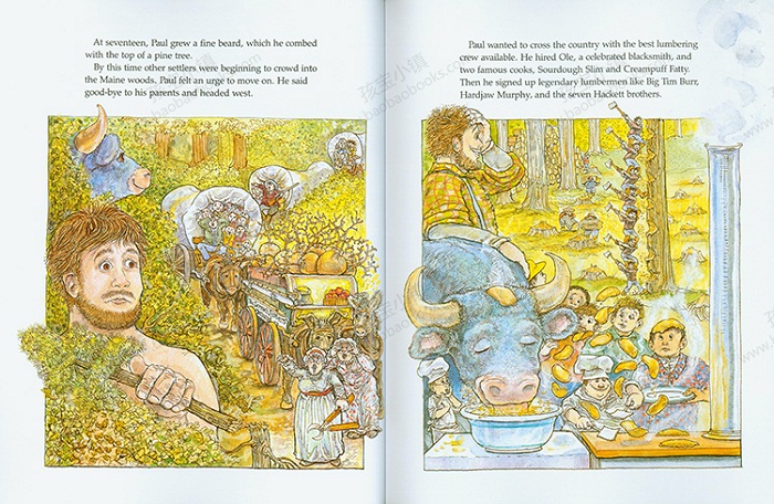 很久很久以前,鲍尔·班扬( Paul Bunyan)出生于缅因州东北部,生下时就奇大无比,需要五只大鸟才能将他带到父母亲身边。婴儿食量惊人,一顿饭能吃得下五十个个鸡蛋和十盘土豆,他父亲还得喂养十头奶牛来给他提供奶源。这孩子吹气球般疯长,有次从床上掉下来引发了一次地震。地震造成不小的恐慌,惊恐的居民要求他们搬出小镇。