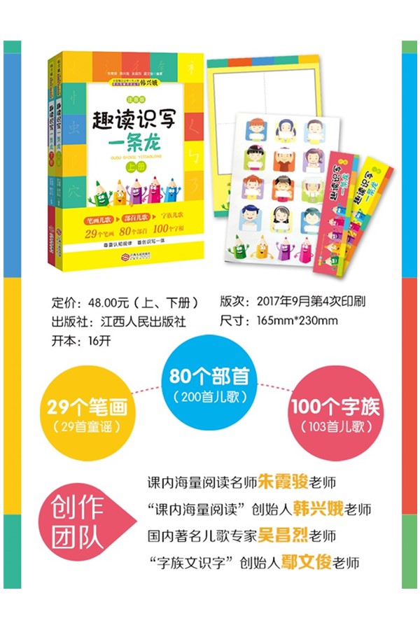 《趣读识写一条龙》(全2册)是由海量阅读团队名师朱霞骏老师,联合“课内海量阅读”创始人韩兴娥老师,国内著名儿歌专家吴昌烈老师,“字族文识字”创始人鄢文俊老师及集美大学汉字学专家金文伟教授,着力为小学生打造的一套识字写字书。全书上下册,上册为 29个笔画三字谣、80个部首230首部首儿歌;下册为100个字根,103首字族儿歌。