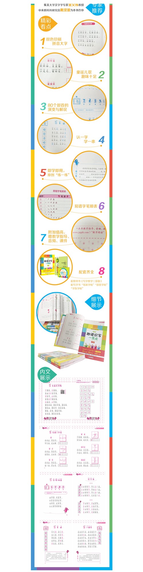 本书部件超多,细节超多,都是一线教师实践的结晶:有笔画名称歌、笔画三字谣、部首总表、字族总表、80个部首的汉字演变和解说、易错字儿歌、易错字笔顺表、书空小彩板、精美书签、游戏小贴纸等等。全书双色印刷,且按印张分为粉色、蓝色、绿色,特点明显,如部首儿歌,有颜色的部首和有颜色的字构成的就是新字,一目了然。
