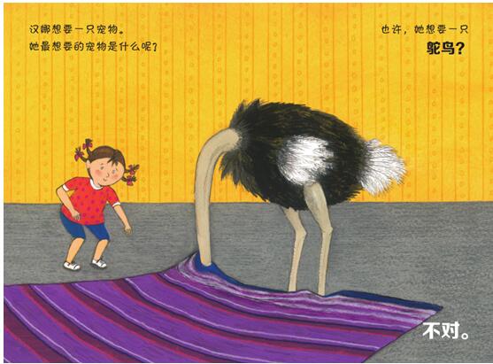 这是小女孩汉娜系列绘本之一。主人翁汉娜是个小女孩,全书都在猜测她最想要什么动物作为宠物,一会猜鸵鸟,一会猜大象……其实她最想要一只小豚鼠。书中小女孩汉娜的形象简单而生动,插画师用简单而明了的线条表现了她丰富的内心活动,一个活泼可爱的小女孩跃然眼前。