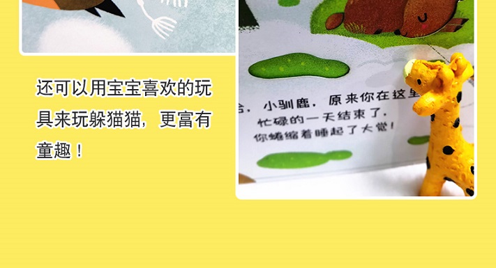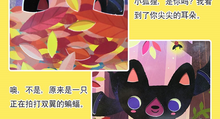 本书中有5处洞洞,透过前面4个洞洞可以看到抽动的鼻子、毛茸茸的大尾巴、尖尖的耳朵、躲在大树之间的身体,每次就在宝宝以为找到小狐狸的时候,翻开却是意外的发现,让宝宝的阅读过程惊喜不断;书中有大量精细的模切图形,树叶、蘑菇、花朵、蜗牛壳等都刻画得细致入微,在宝宝眼前呈现出一个可以看可以摸的奇妙世界,宝宝可以在探索感知中锻炼小手灵活性。