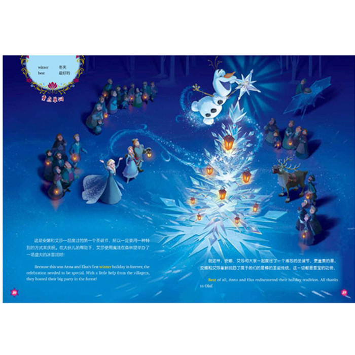 《冰雪奇缘番外双语故事(官方电影版):*棒的圣诞传统》一册讲述了:阿伦黛尔王国迎来了第一个全民圣诞节,可是艾莎和安娜没有属于她们的圣诞传统。雪宝知道后,跟驯鹿斯特一起为姐妹俩收集*棒的圣诞传统。没想到在经过一处山谷的时候,所收集的物品随着雪橇翻下了悬崖,雪宝也在森林里迷路了。艾莎和安娜好不容易在森林里找到了雪宝,并且告诉雪宝,她们的*棒的圣诞传统就是雪宝。随后,艾莎使用魔法在森林里举办了一场盛大的冰雪派对来庆祝这个难忘的圣诞节。