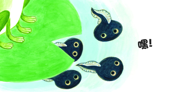 怎么看不见青蛙宝宝呀?青蛙宝宝从妈妈身旁的荷叶下游出来,说:“嘿!”原来他在这里!