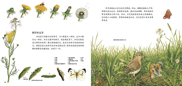 这本书描述了许多不同的动植物一起生长的草地。