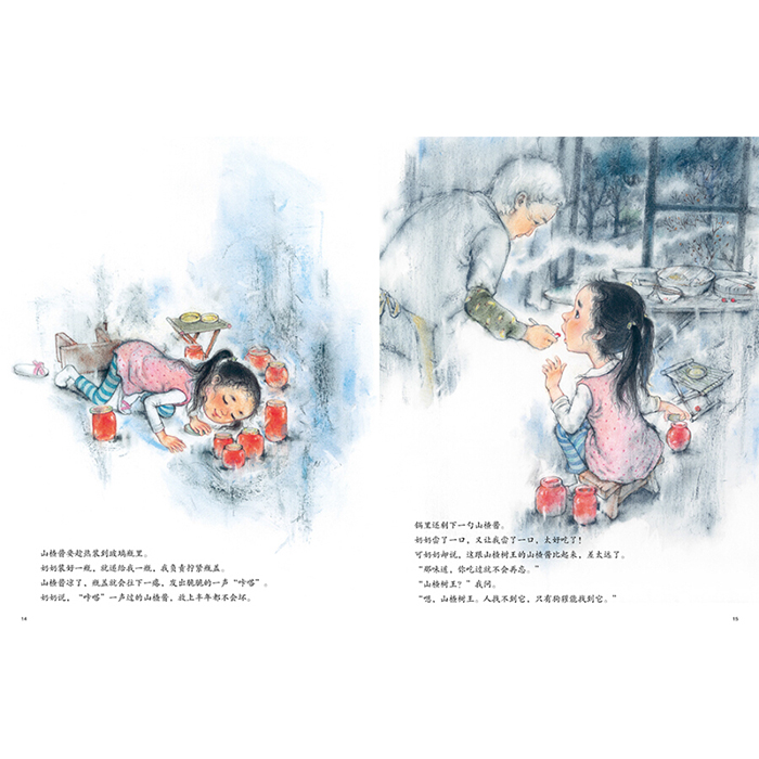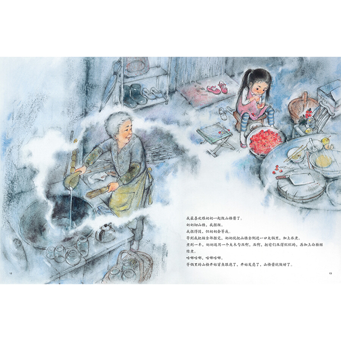 作者把快乐刻画得那么丰厚,每一幅画面都仿佛鼓满了欢快的风:袅袅的炊烟,噼里啪啦往下落的山楂果,奔跑的小姑娘和她头上荡来荡去的发辫,还有她做山楂酱时抠、洗、切、煮的动作,全都像风吹过,带着快活爽朗的气息……让人体会到生命满满的喜悦和感动。