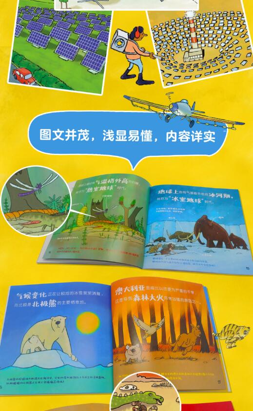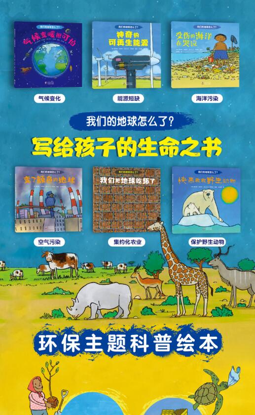 《气候变暖很可怕》:随着人类活动范围的不断扩大,环境随之发生改变。本书作者从地球变迁开始,讲述了地球从初到现在,内外因共同作用下,引发的气候变化。恐龙因何灭绝,人类的活动如何导致天气频发,使得人们越来越关注气候改变对人类造成的影响。 我们怎样才能阻止地球过度升温呢?要想减少温室气体的排放,我们又应该做出怎样的努力呢?本书运用简单易懂的数据,轻松活泼的语言,优美的画面,为读者提供了详实的科学依据及浅显易懂的理论知识,在了解环保知识的同时,帮助孩子掌握环保技能。 《神奇的可再生能源》:本书分别介绍了地球上的不可再生资源和可再生资源。同时,作者向读者介绍了进入现代化工业时代后,人类对不可再生资源的巨大消耗,使得我们不得不开发新能源用以替换石油、天然气等不可再生资源。此外,还向读者详细而生动的介绍了清洁型能源在环境保护方面的优势,对保护我们的地球有至关重要的意义。作者用生动的图画与文字向读者们讲述了人们正在依靠技术进步解决这些众多能源与资源日渐匮乏的问题。 《受伤的海洋在哭泣》:我们的地球有大约71%的面积被海水所覆盖,海洋对我们来说,意义重大。海洋为生态系统调节所起到的至关重要的作用。同时,在现代生活的影响下,海洋同样面临人类活动的破坏,有些时候是意想不到的结果。本书生动细致的讲述了滥用化肥、垃圾污染、过度捕捞等行为对海洋环境造成破坏。我们应该采取怎样的方法来保护地球生态环境,化解海洋面临的危机呢? 《变了颜色的地球》:本书更加详尽地介绍了人类活动的方方面面对环境造成的破坏和污染,无论是的山峰……还是深的海底。大气污染、温室效应、水污染等等,各个国家都开始关注这个问题,为保护我们的地球而做出努力。本书运用简单易懂的数据,轻松活泼的语言,优美的画面,为读者提供了详实的科学依据及浅显易懂的理论知识,在普及环保知识的同时,帮助孩子掌握环保技能。 《我们把地球吃坏了》:本书从集约化农业开始切入,在人口不断增长的,集约化农业确实可以带来粮食的丰收、畜牧业的繁荣发展。但与此同时带来的问题也非常明显,土地得不到修养,以至于土壤越来越贫瘠,不得不依靠化肥来增加产量,滥用农药使得农作物表面留有大量药物残留,危害人类的身体健康。到底要怎样防止这样的情况发生? 《快来救救野生动物》:地球上生活着多种多样的生物,很多生物早于人类诞生于这个星球。然后,人类的活动以及随之而来的气候变化,却越来越多的对原本生活在地上的生物造成威胁。本书从人类无节制得滥砍滥伐、过度捕捞、大气污染、现代工业等方面,细致的向读者讲述了这些行为给野生动物带来了巨大的灾难。同时向读者传达了人类保护行动势在必行的意识与决心。