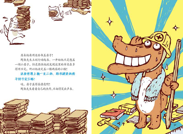 本书讲述了一位“邋遢鬼”——鳄鱼叔叔如何通过一本本废弃的书建造房子,并让大家爱上读书的有趣故事。“我,我,我太,太喜欢书了!”说话结结巴巴、在人们面前有些害羞的鳄鱼大叔和村子里的人相处得并不融洽。最能让孤单的鳄鱼大叔快乐起来的方法就是读书! 可是村里人讨厌书,还把鳄鱼大叔装满书的家看成了垃圾堆。最后,它们竟然把鳄鱼大树赶出了村子。埋在书堆中的鳄鱼大叔想到一个好办法,他用书盖了一栋大房子!这回可没人再嫌弃他了,他现在成了鳄鱼图书馆的馆长,全村的人都来他的家里书!