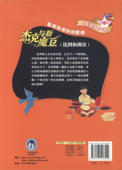 《杰克与新魔豆》(知识点:比例和测量)杰克爬上长长的豆茎,认识了一个新朋友。这位新朋友是个巨人男孩儿,足足有五个杰克那么高!他们想一起玩篮球,可巨人的篮球对杰克来说太大了。杰克想做一副巨人也能下的棋,怎么才能知道棋应该做多大呢?当杰克想邀请巨人去家里做客时,更大的麻烦出现了——他们需要做一个和豆茎一样长的绳梯,怎样才能量出豆茎的长度呢?