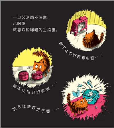 主人艾米丽的不断唠叨,让一向受溺爱的喵喵先生不满现有的枯燥生活,抓住机会逃了出去,而街上肮脏、寒冷、寂寞的生活并不是他所期望的,于是他大彻大悟:艾米丽已赋予他一只猫所梦想的一切,而他却从未加以回报。书中最搞笑的一幕是:喵喵先生给家里老老实实打电话,可怜巴巴地冲着主人喵喵叫,并很快和主人重归于好,“现在他们都意识到能相互拥有是多么幸运的事。”虽然作者的叙述很朴实,但劳埃德的机智卡通插图大大弥补了平铺直叙文体的欠缺,在书的结尾处,喵喵先生黑色的粗糙毛发变得相当柔软,眼睛也像主人的一样越发透出机灵和爱意。很显然,这预示着他们的关系复苏的开始。