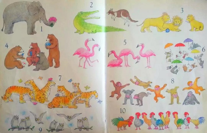 这是一本精彩的计数书,同时涉及很多动物名称的英语表达。作为英语启蒙初级书,能帮助孩子记忆数字单词、动物名称。