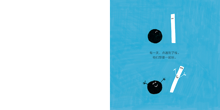 一条不宽不窄、不长不短的白线和一个不大不小、圆头圆脑的黑点,他俩有一天相遇了,想要一起玩。两个人在一起,变成了一只跷跷板、一把班卓琴、一只蜗牛、一个飞机螺旋桨……