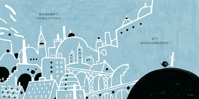 绘本的情节与图画完美地融合在一起,成就了一堂超级生动的绘画启蒙课。绘者童稚的画法更突显了创意的美妙。而其中点和线的许多“冷门”组合不乏幽默,比如班卓琴、独轮车等……绘本的大部分篇章都使用蓝、黑、白三种颜色混搭在一起,制造出简洁大方的艺术效果。而随着造型的花样翻新,配色也逐渐丰富起来,像是在大声邀请读者拿起笔,一起加入这场造型与色彩的狂欢!