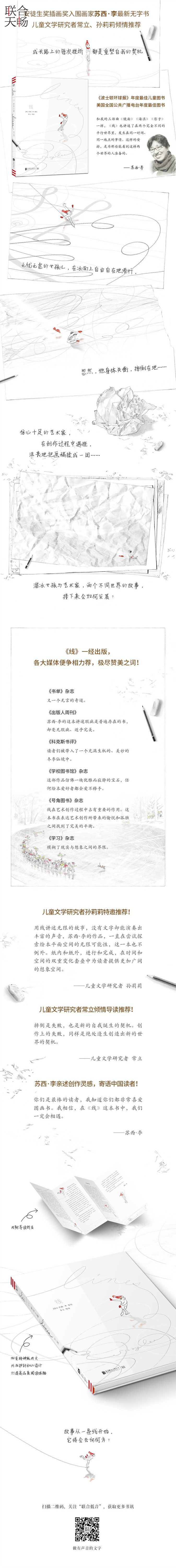 故事开始于一条线。一个灵巧的溜冰者在冰上制作出美丽的线条。直线、曲线,组合无穷无尽。突然,溜冰者摔倒,破坏了故事的流动性。作者似乎对这一发展感到不满,于是在下一页重新开始绘图。相信在这本无字绘本中,每个读者都能获得不同的体验。故事开始于一条线,这条线将走向哪里? 一本无字绘本,讲述成长过程中如何重塑自我的生命故事。