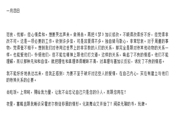 这是托尔斯泰在1910年,也是他在世的ZUI后一年写下的日记,从1910年1月2日写起,到11月3日结束,共计266篇。 82岁的托尔斯泰,记述日常、家人、不能避免的开心或者不开心,记述跟我们每个人差不多的生活:每天散步、玩牌、骑马兜圈子的日常,开心或者不开心的情绪,每天发生的有趣的事情……而除却这些,他每天还在亲力亲为地校对、修改自己的书稿,回复全世界各地的来信,帮助民众解决问题,进行很多关于宗教、人类、创作等的思考,一位82岁的老人,还能有这样旺盛的精力和清晰的头脑,让人由衷地升腾起一种敬意。 同时,还记述了他计划了40年的离家出走,“为要使自己一辈子的 后几天在孤独和静寂当中过去而隐遁于世外”。1910年10月28日(俄历),托尔斯泰给妻子留书一封,而后离家。路途中生病,11 月 7 日,逝世于离家出走途中的一个小车站。