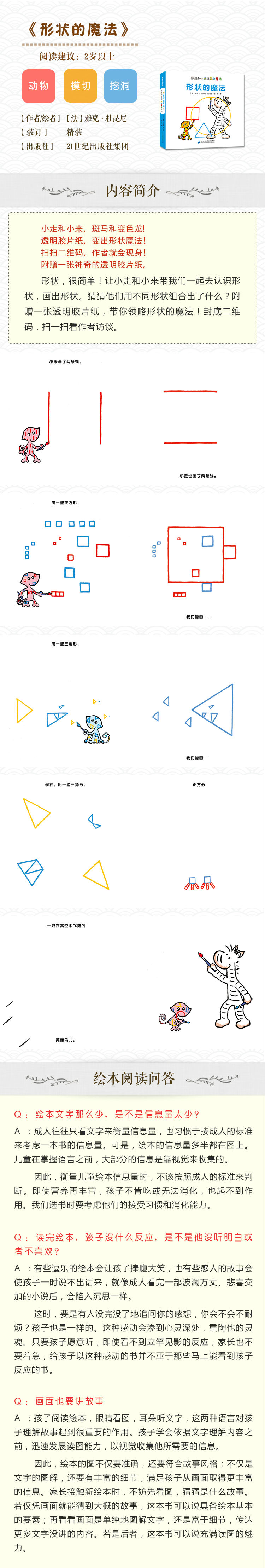 小走和小来,斑马和变色龙!透明胶片纸,变出形状魔法!扫扫二维码,作者就会现身!附赠一张神奇的透明胶片纸,涂一涂,玩一玩,形状游戏。
