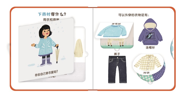 食物、交通工具、宝宝生活、衣着四大跟宝宝密切相关认知主题,认知几十种常见事物。翻翻 转盘等精巧工艺设计,增加阅读兴趣。这本书介绍了不同天气和季节应该穿的衣服,每种衣服有不同款式、造型和花色,并且在翻页下面附有详细的穿衣服和脱衣服的步骤,另外还附有各种衣服的配饰,例如帽子、手套等等。全面详细地分析了如何穿衣服、穿什么样的衣服,帮助宝宝提高自理能力。转盘设计让宝宝可以随心所欲切换衣服的图案,给书中的小朋友换上合适的衣服,增强互动性,引导宝宝动手动脑。