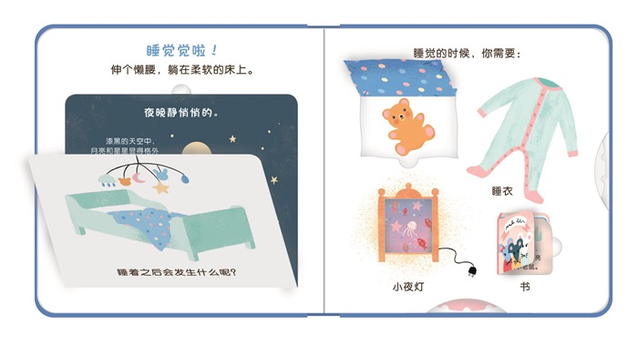 每个跨页的右边,则是围绕左边大翻页的主题,用小翻翻页讲其他相关的小知识。比如左页说了户外有哪些好玩的事情,右页会讲,出去玩可以带什么呢。这样的设计可以培养宝宝的联想记忆和发散思维。