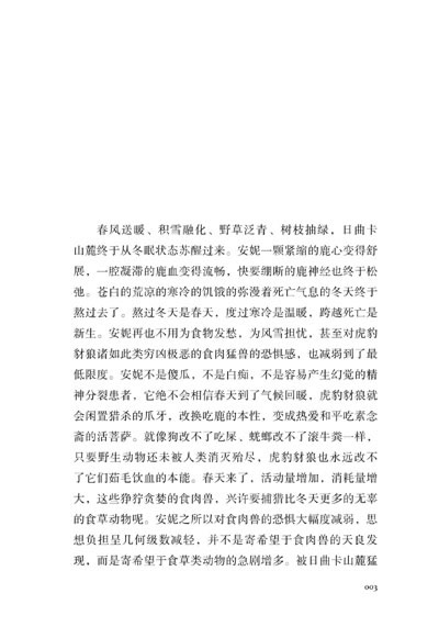 春风送暖、积雪融化、野草泛青、树枝抽绿,日曲卡山麓终于从冬眠状态苏醒过来。安妮一颗紧缩的鹿心变得舒展,一腔凝滞的鹿血变得流畅,快要绷断的鹿神经也终于松弛。苍白的荒凉的寒冷的饥饿的弥漫着死亡气息的冬天终于熬过去了。熬过冬天是春天,度过寒冷是温暖,跨越死亡是新生。安妮再也不用为食物发愁,为风雪担忧,甚至对虎豹豺狼诸如此类穷凶极恶的食肉猛兽的恐惧感,也减弱到了最低限度。安妮不是傻瓜,不是白痴,不是容易产生幻觉的精神分裂患者,它绝不会相信春天到了气候回暖,虎豹豺狼就会闲置猎杀的爪牙,改换吃鹿的本性,变成热爱和平吃素念斋的活菩萨。就像狗改不了吃屎、蜣螂改不了滚牛粪一样,只要野生动物还未被人类消灭殆尽,虎豹豺狼也永远改不了它们茹毛饮血的本能。春天来了,活动量增加,消耗量增大,这些狰狞贪婪的食肉兽,兴许要捕猎比冬天更多的无辜的食草动物呢。安妮之所以对食肉兽的恐惧大幅度减弱,思想负担呈几何级数减轻,并不是寄希望于食肉兽的天良发现,而是寄希望于食草类动物的急剧增多。被日曲卡山麓猛烈的暴风雪驱赶走的斑羚、岩羊、黄麂、野驴、香獐、狍子,还有同类马鹿,在体内生物钟的精确召唤下,成群结队从遥远的南方迁徙回来了;被春阳丽日晒照着的日曲卡山麓,黑土肥沃牧草油绿泉水清亮野花芬芳,是食草类动物的理想乐园和蓬莱仙境。食草动物增多,也就意味着数量相对稳定的食肉兽捕捉的目标增多,猎杀的对象增多;也就无形中减轻了母鹿安妮的生存压力。好比饕餮之徒面对一盘菜肴必然穷夹猛吃盯牢不放,但假如满桌珍馐,几十只冷盘热炒山珍海味花样翻新琳琅满目,它也就不会死盯着其中的一盘菜肴必欲吃尽而后快了。再说鹿肉虽然好吃,可小黄麂的味道更加鲜美;斑羚虽然善攀登,香獐虽然善跳跃,但嗅觉和视觉都不如马鹿灵敏,体格不如马鹿健壮,奔跑的速度也不如马鹿快捷。这意味着同样处于食肉兽觊觎之中,马鹿要比其他食草动物多一分逃生的可能。再说食草动物品种繁多,在河谷山坡草滩星罗棋布,也可以混淆捕食者的视线,搅乱捕食者的注意力,使它们心猿意马,要捡西瓜丢芝麻,要捡芝麻丢西瓜,最后极有可能芝麻也丢了西瓜也摔了。这好比野雉啄食一只蚂蚱容易,倘若面前一群蚂蚱,它反倒不知啄谁才好,顾此失彼疲于奔命,弄到最后连一只蚂蚱也逮不到。基于这种生存技巧,很多种类的弱小动物便成群结队,即使食物匮乏也不愿群体瓦解化整为零被天敌各个击破。这种弱者的生存技巧虽然很窝囊、很憋气却十分有效。