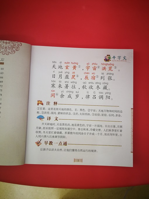 千字文,由南北朝时期梁朝散骑侍郎、给事中周兴嗣编纂、一千个汉字组成的韵文(在隋唐之前,不押韵、不对仗的文字,被称为“笔”,而非“文”)。梁武帝(502—549年)命人从王羲之书法作品中选取1000个不重复汉字,命员外散骑侍郎周兴嗣编纂成文。全文为四字句,对仗工整,条理清晰,文采斐然。