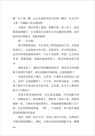 这个地方虽好,但也有天敌存在。天空中有老鹰,树丛里也藏着狼和狐狸;就是走在草地里,也要特别留心,因为有蛇盘成一团或者缠绕在野蒿上,这些家伙都威胁着它的安全;更危险的,是人和猎狗,好多人常常围成一个大圆圈,大圆圈不断地缩小,然后把狗放出来,“汪汪”地叫,等兔子们跑出来,猎人们就端着猎枪“咚咚”地射击,十有八九,兔子们是很难逃脱的。