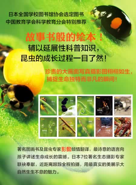 这是一套来自日本的著名生物摄影专家献给孩子们的昆虫摄影绘本集,摄影师们经过长期的实地跟踪拍摄,用分镜头写真大画面的形式淋漓尽致的展示了可爱的昆虫们产卵——孵化——小生命诞生——生长成熟的整个生长过程。那些栩栩如生的大画面写真图片生动而细致到令人感动。摄影师们或微观近拍、或宏观远景,用独特的视角收藏了小昆虫们生长的每一个精彩的瞬间,生生不息的大自然中生命独特而非凡的闪光点被一一收录。在每一册中,作者都会用忍不住怜爱的语气写道:“长啊长啊,长啊长啊,快快长大吧!”可以说,《生命的故事》揭示了生命之初的惊喜和其动人的生长过程,震撼的写真的图片,简洁而诗意的语言,将艺术欣赏与学习认知的功能融为一体。