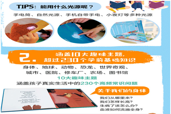 手电筒互动页正面问题、背面答案:看到问题想一想,思考之后看答案。“Q&A一问一答”的情景探索式阅读不仅能够在游戏中学得知识;还能够轻松唤起孩子的阅读兴趣,培养独立思考的习惯和能力,激发主动探索的学习精神,挖掘发散性思维,带给家长和孩子新鲜的亲子阅读互动体验。