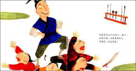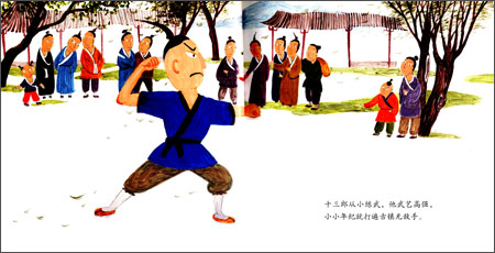 《中国儿童原创绘本:古镇十三郎》内容简介:十三郎从小练武,他武艺高强,小小年纪就打遍古镇无敌手。他最喜欢与人比武了,赢了,趾高气扬,还要羞辱别人。问题是,他总是赢。南街的赵大生得虎背熊腰,力大无穷,他能一只手举起庙前的大香炉,赢得人们狂呼叫好。