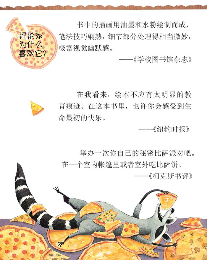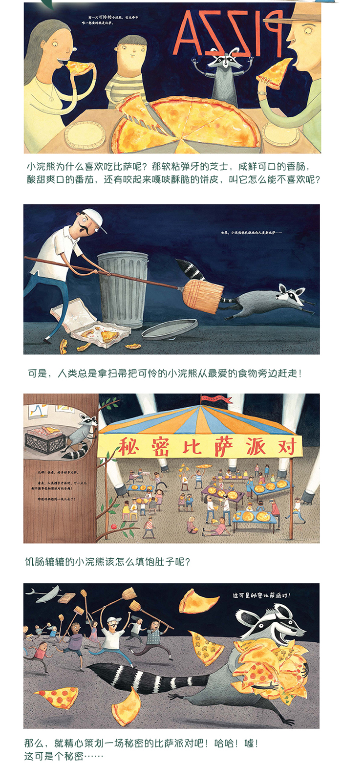 小浣熊为什么喜欢吃比萨呢?那软粘弹牙的芝士,咸鲜可口的香肠,酸甜爽口的番茄,还有咬起来嘎吱酥脆的饼皮,叫它怎么能不喜欢呢?可是,人类总是拿扫帚把可怜的小浣熊从*爱的食物旁边赶走!饥肠辘辘的小浣熊该怎么填饱肚子呢?那么,就精心策划一场秘密的比萨派对吧!哈哈!嘘!这可是个秘密……