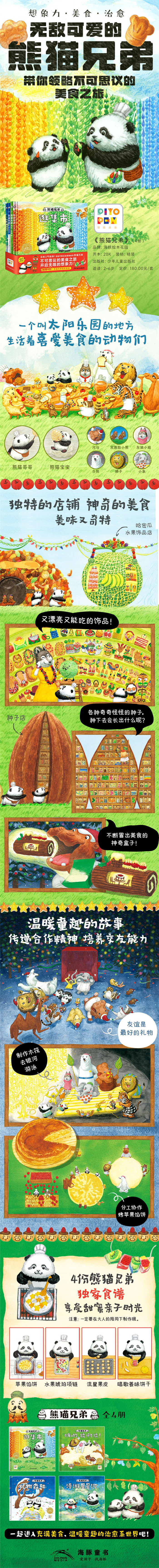 熊猫兄弟》是一套第一眼就会喜欢上的绘本,刚开始读者会被画风、可爱的动物形象所吸引,读了故事后,会感叹故事太温暖、太有趣、太有想象力了! 书里的动物生活在一个充满美食的太阳乐园,这里有会变出礼物的森林,有酸奶泉、有闪闪发光河,每年乐园还会举办一次集市,集市里有各种各样奇特的店铺,嘭嘭面包店、水果饰品店、风的饮料店,光听名词就很有趣,甚至希望现实生活中有同款店铺。 动物们的故事也很治愈、梦幻,比如《嗨哟,揉啊揉!》,天还没亮,动物聚集到山坡做苹果馅饼,而且一定要在太阳公公升起前做好。为什么呢?因为今天是太阳公公的生日。有趣的是,太阳公公吹蜡烛的同时把馅饼烤熟了。真是让人脑洞大开。在《漫游星星河》里,大家竟然还乘着木筏去银河里游泳! 这套书很适合亲子阅读,香喷喷、有趣又好吃的食物,温暖治愈的故事,超萌可爱的动物,并且每册还附带一份熊猫兄弟du家食谱,亲子阅读后和孩子一起制作奇特的美食吧!